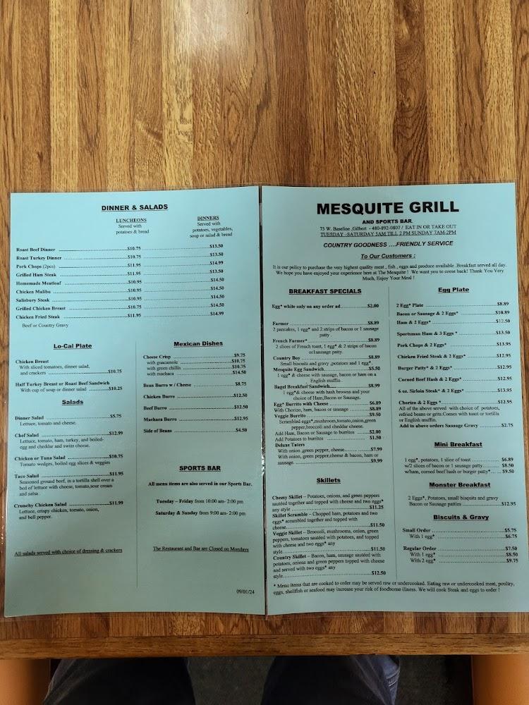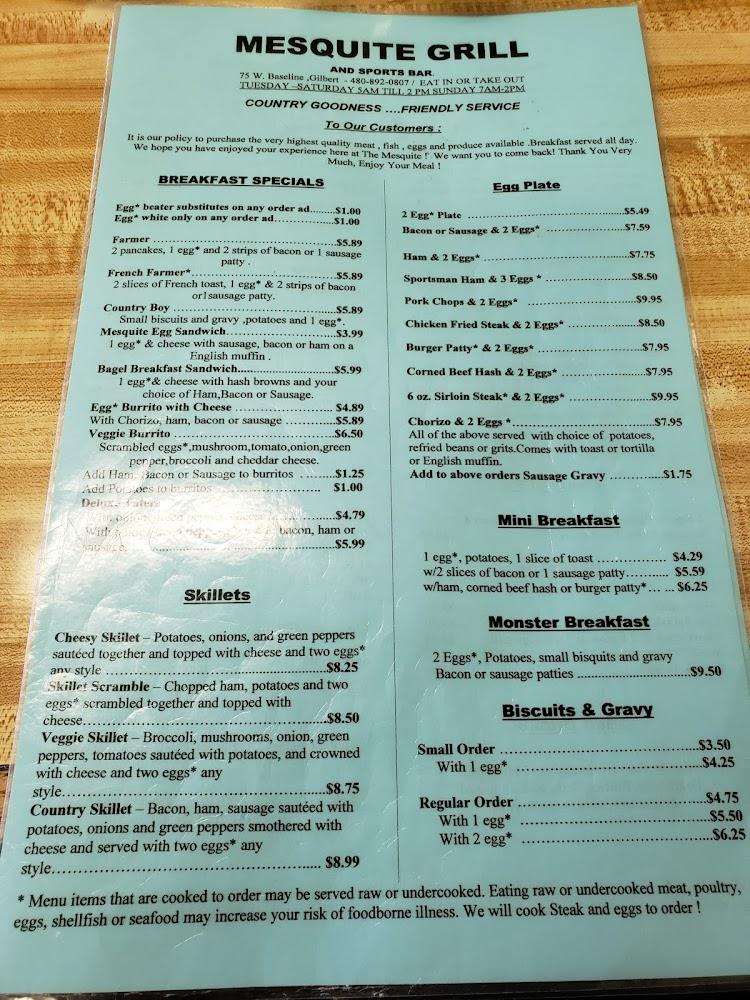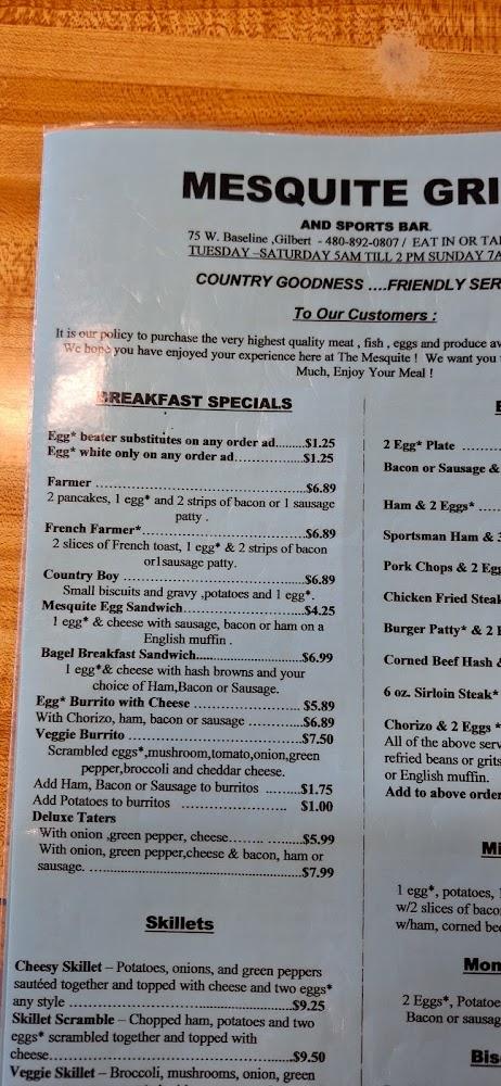 Welcome to Mesquite Grill and Sports Bar, your go-to destination in Gilbert, AZ, for a vibrant sports bar atmosphere and delicious grilled cuisine! Located conveniently at 75 W Baseline Rd, we offer a diverse menu with mouthwatering breakfast options and classic grill favorites. Enjoy excellent cocktails and a wide selection of beers while catching the latest sports action on our big screens. With both indoor seating and a charming outdoor patio, we cater to families, solo diners, and groups alike. Our welcoming atmosphere and friendly service make every visit memorable. Join us today for an unforgettable dining experience!